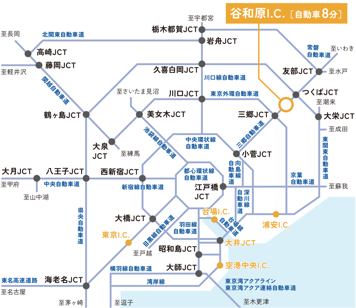 東京と北関東、東北エリアをつなぐ常磐自動車道は、マイカーでのレジャーやビジネスでのアクセス性を高めます。つくばJCTからは、 東北自動車道や関越自動車道につながる圏央道を利用でき、さらに移動範囲が広がります。