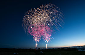 昭和5年、大利根橋の開通を記念して始まった伝統のある花火大会です。ワイドスターマインや中国花火などの約7000発の花火が打ち上がります。