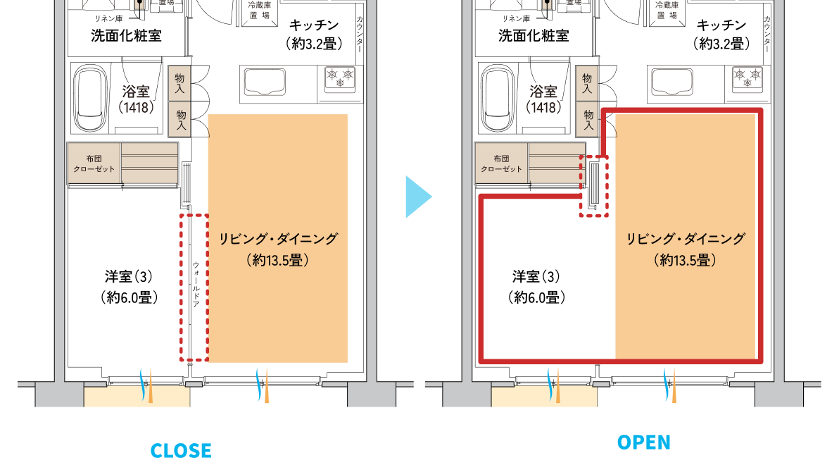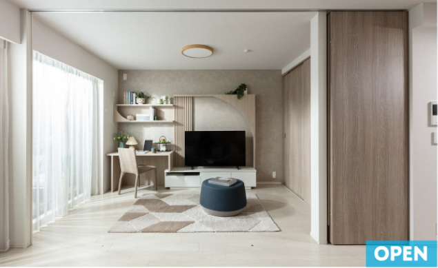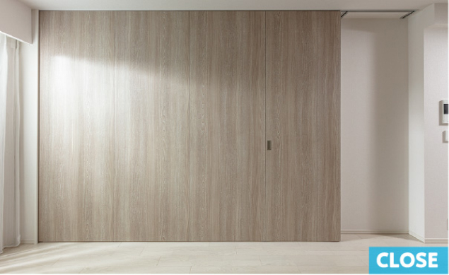 リビング・ダイニングに隣接した洋室の間仕切りには、ウォールドアを採用。リビングとの一体化で広々とした空間として利用できるうえに、個室としても使えます。