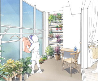 バルコニーで乾かした洗濯物を取り込みたたむスペースや、室内干し的にも利用できます。