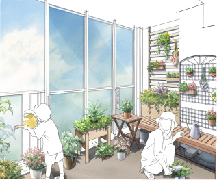 スクリーンに覆われたパティオテラスでは雨風が苦手な植物など、天候にさほど左右されないガーデニングを楽しめます。