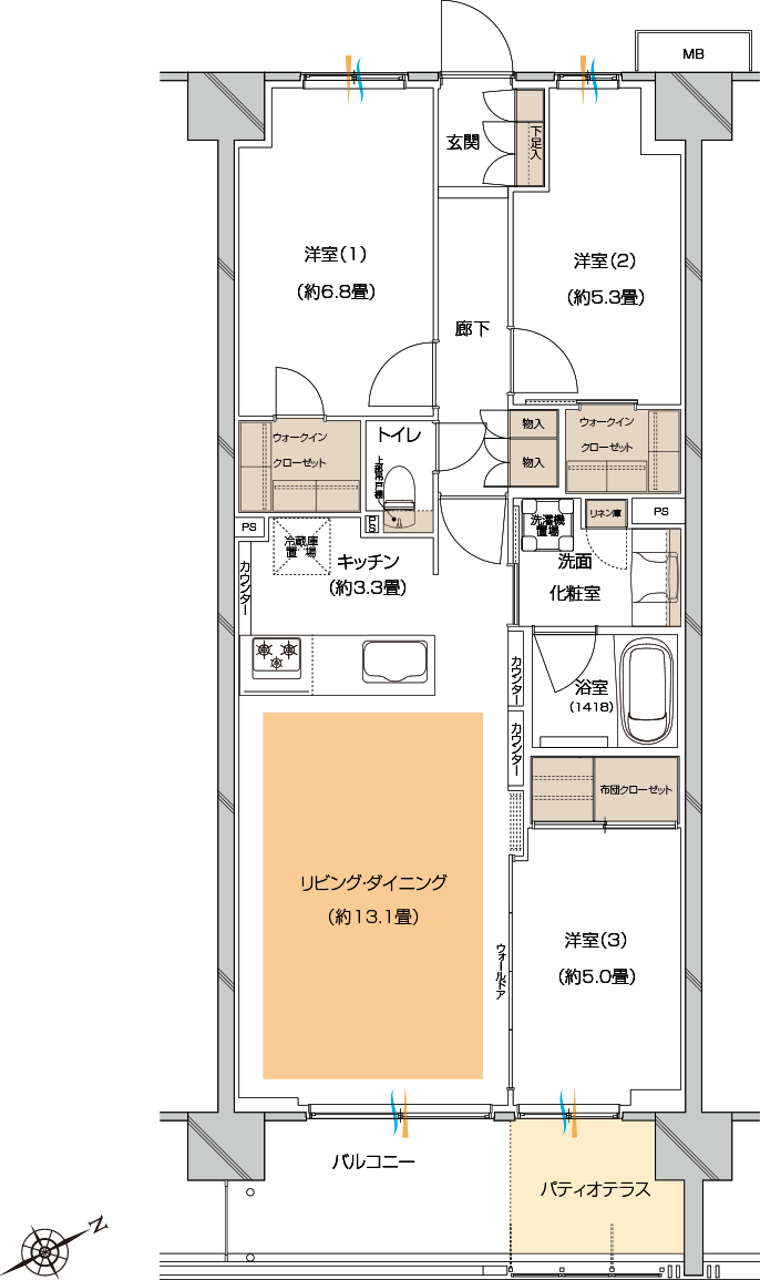 ■ 洋室(3)はパティオテラスと一体化でき、