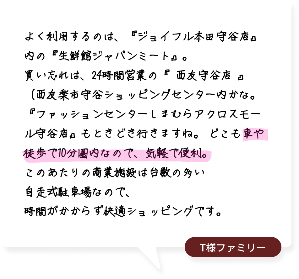 どこも車や徒歩で10分圏内なので気軽。時間がかからず、快適ショッピングです。
