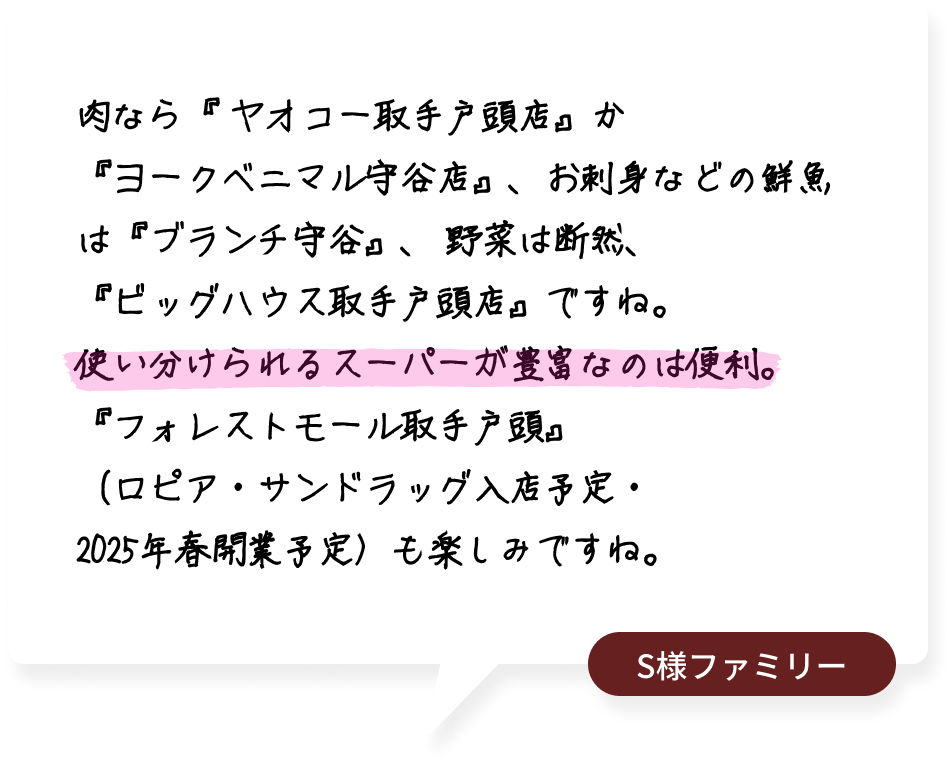 目の前の『西友楽市守谷ショッピングセンター』や、豊富な生鮮食品が揃う人気の『ブランチ守谷』、『業務スーパー守谷店』も生活圏。日常生活が豊かになる暮らしです。
