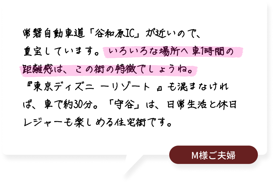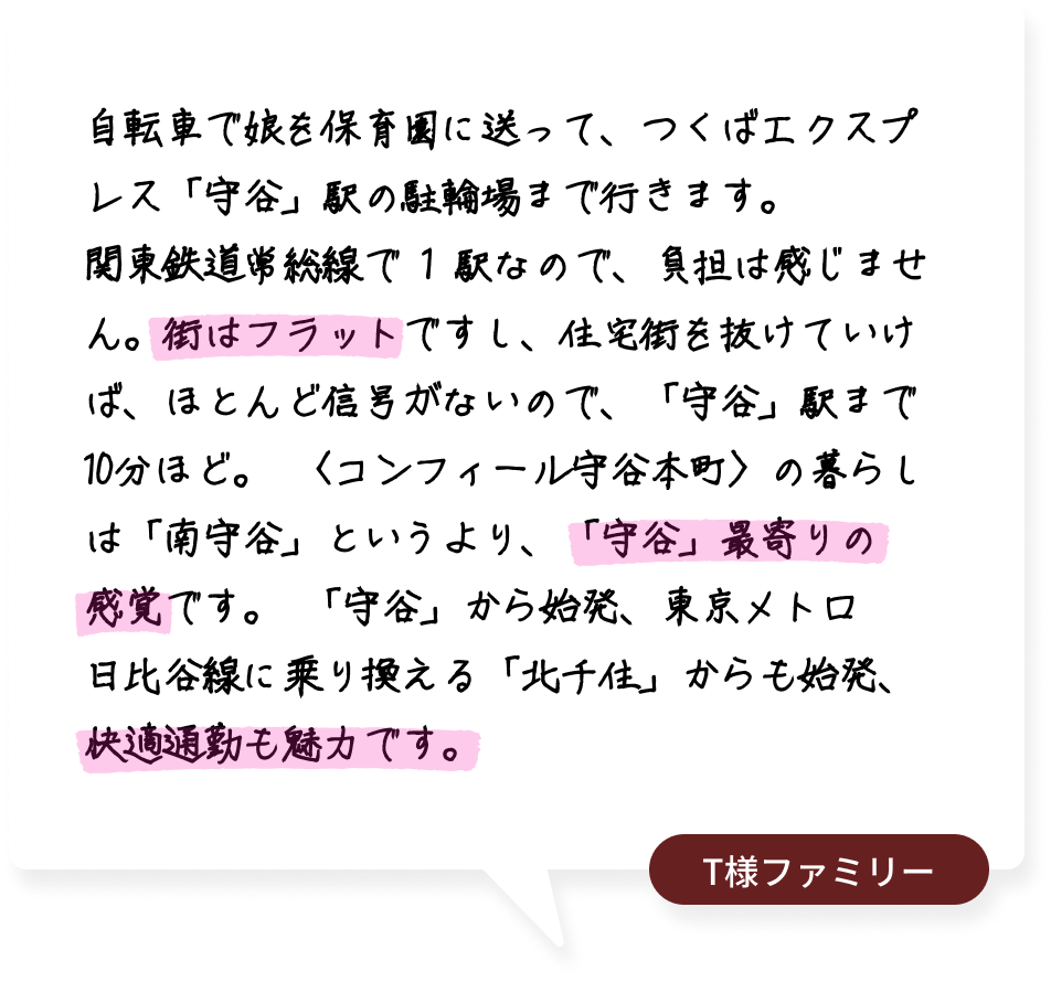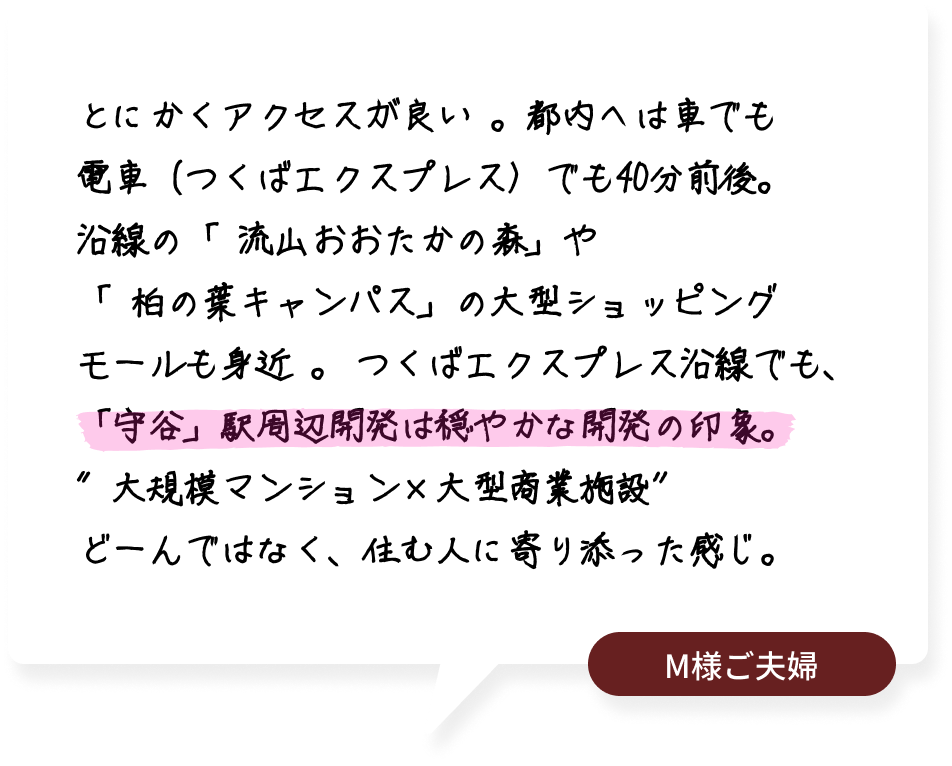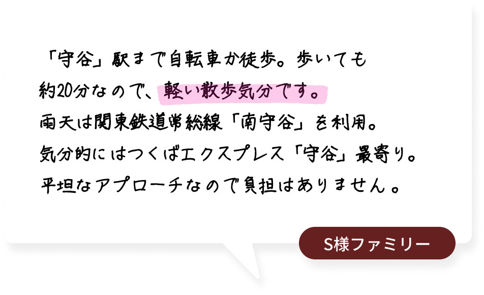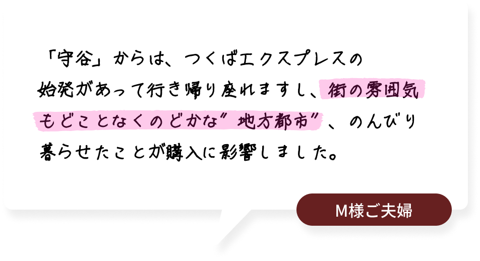 ここに暮らして実感したのは、つくばエクスプレス「守谷」駅までの距離感。