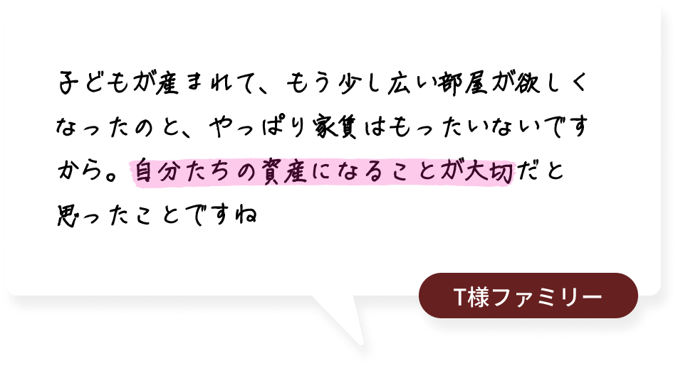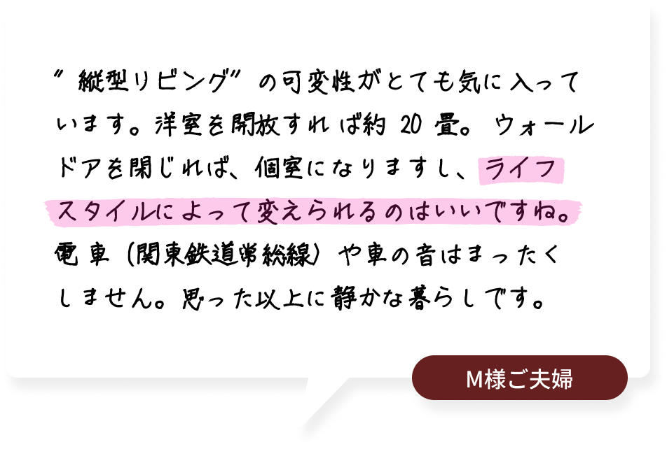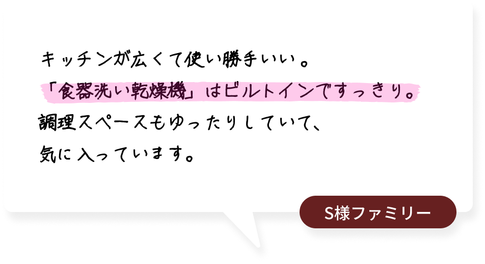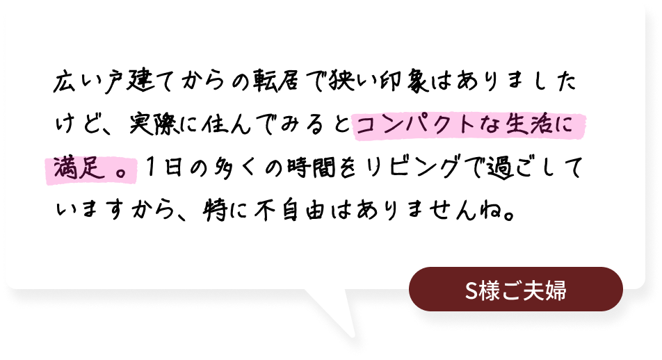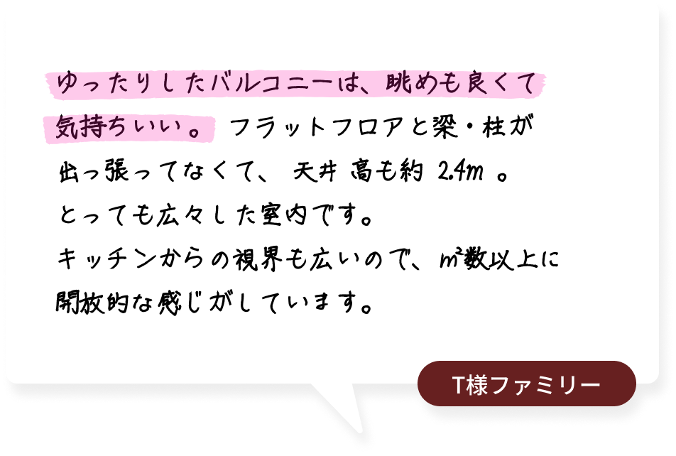 梁や柱の出っ張りもなく約2.4mの天井高とともに、開放的な住空間に満足しています。