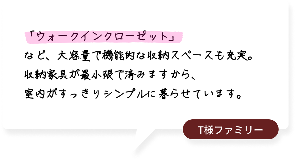 「ウォークインクローゼット」など、大容量で機能的な収納スペースも充実。